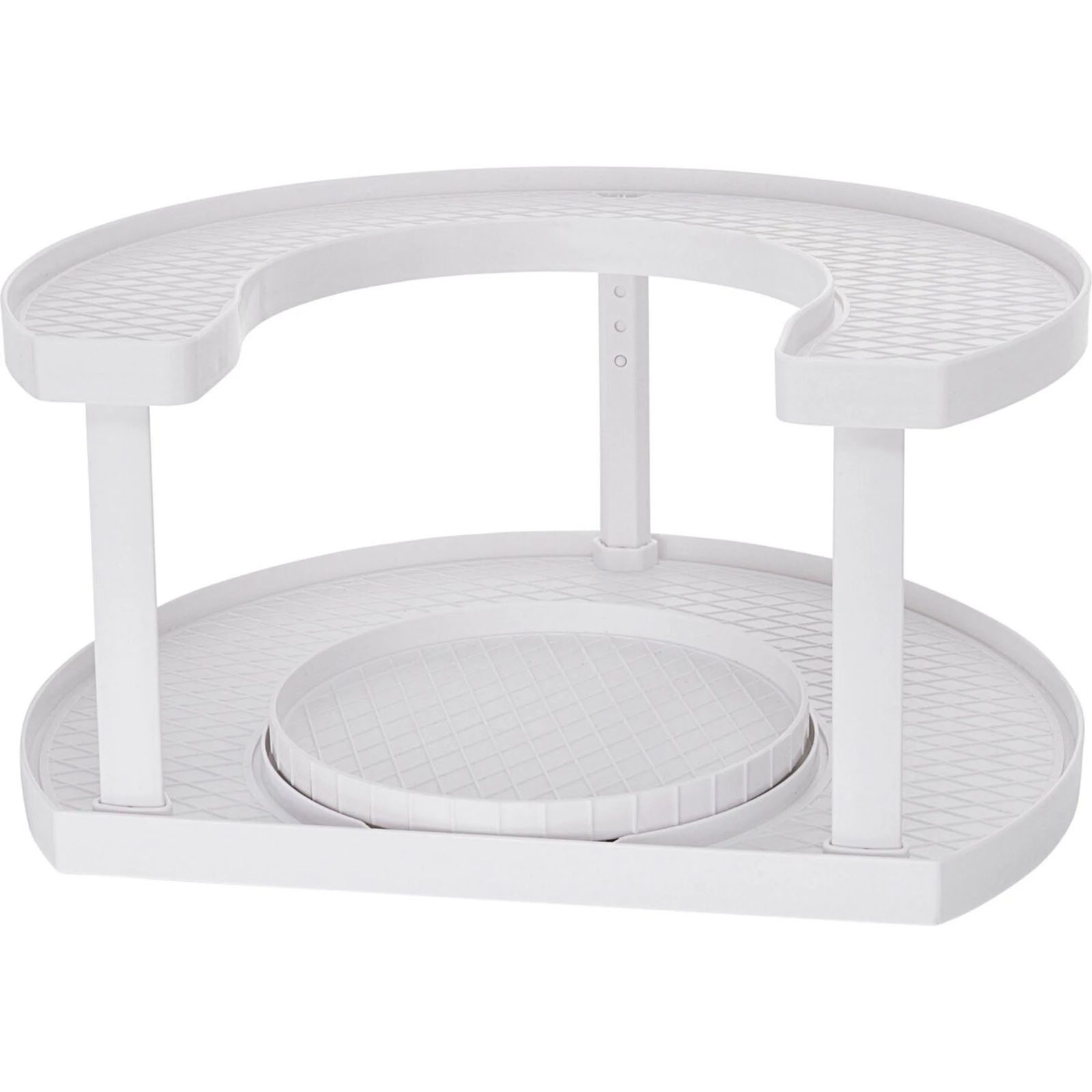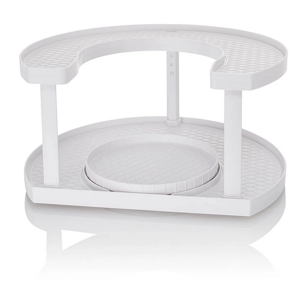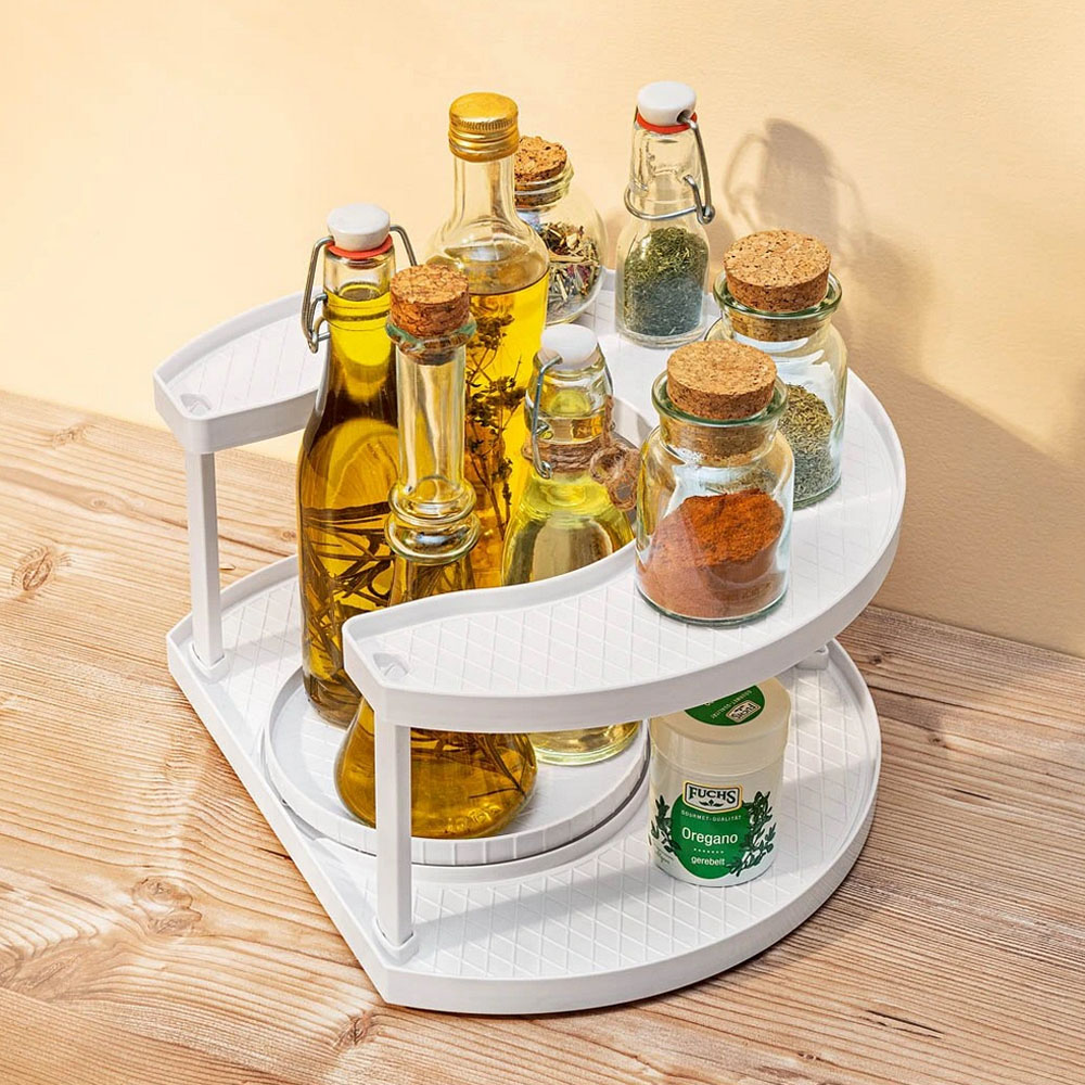 Praktisches drehbares Regal für die Küche oder auch für das Badezimmer oder andere Einsatzgebiete. Auf den zwei Ebenen lassen sich Gläser, Gewürze, Flaschen, Reinigungsflaschen, Küchenutensilien, Badutensilien uvm. unterbringen: Das komplette Regal ist um 360 Grad drehbar, so können sie sich das gewünschte Produkt jederzeit schnell nach vorne holen ohne lange kramen zu müssen.